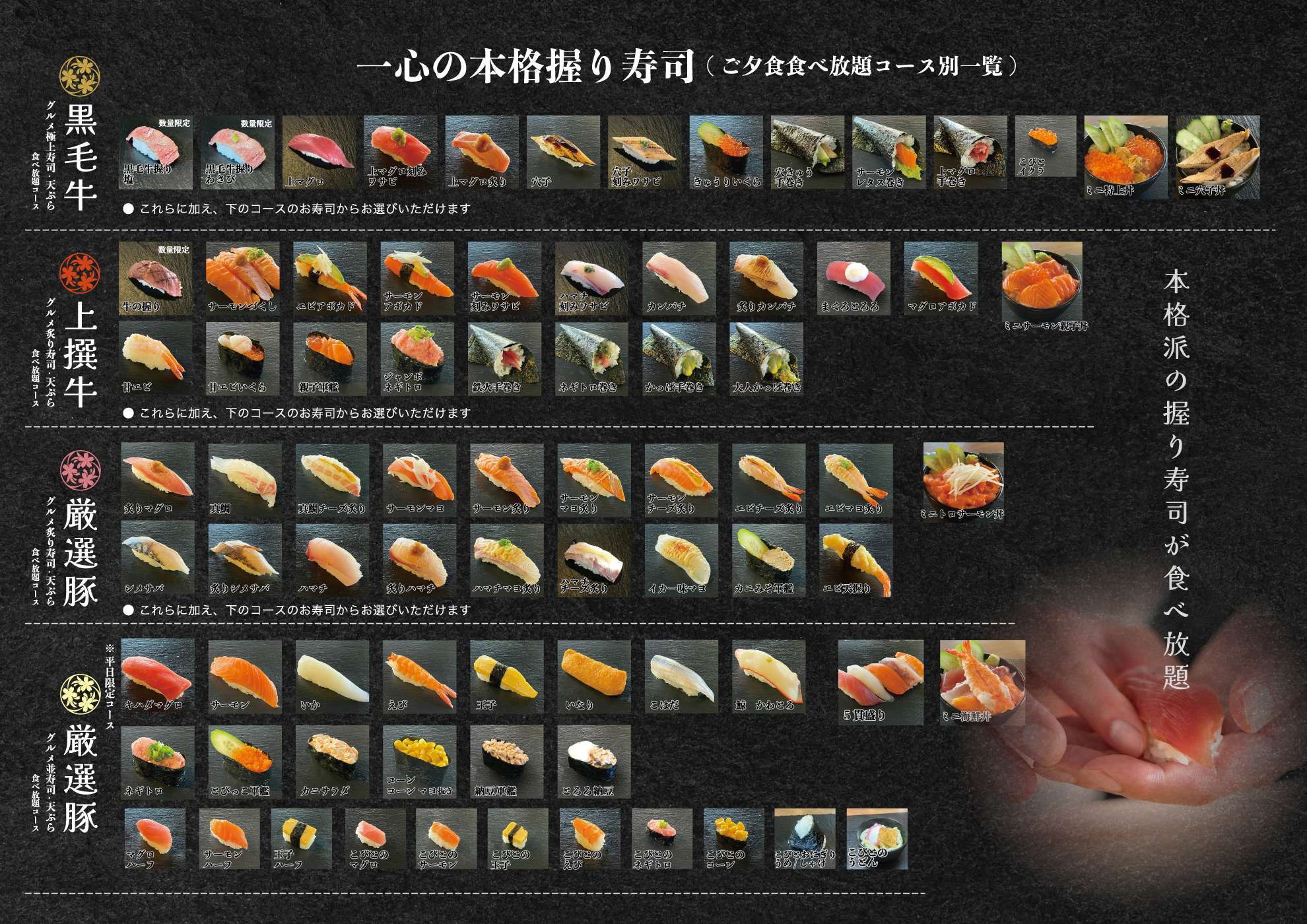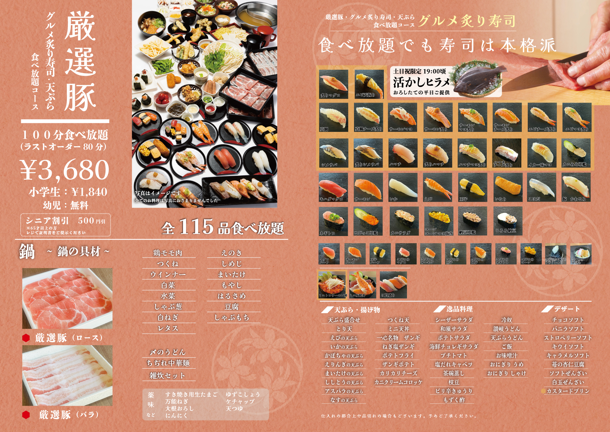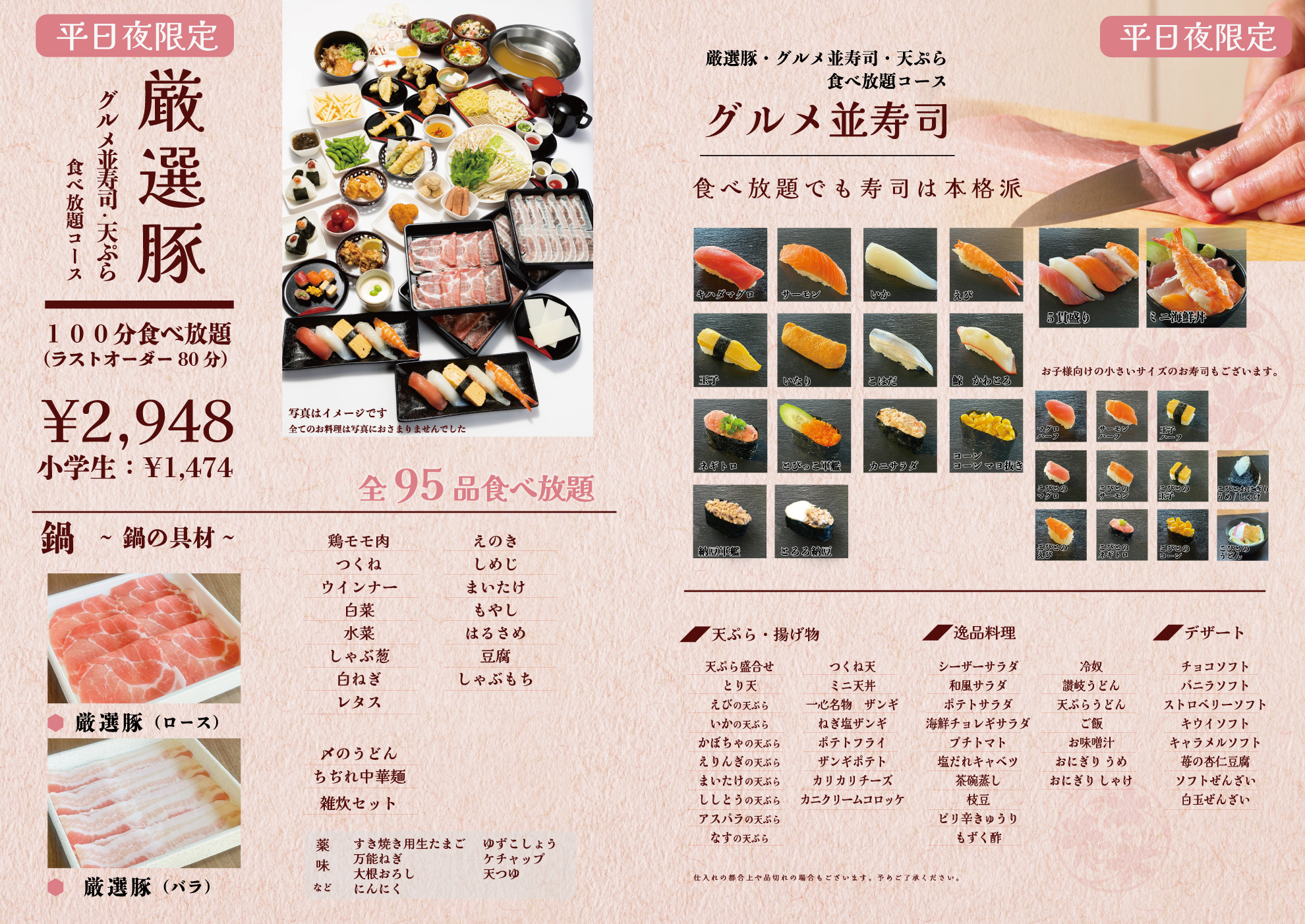 ※平日限定 厳選豚・天ぷら・グルメ並寿司 食べ放題コース(全95品)