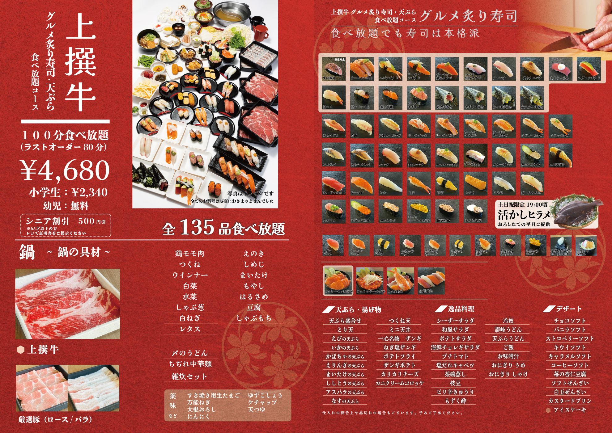上撰牛・天ぷら・グルメ炙り寿司 食べ放題コース(全135品)