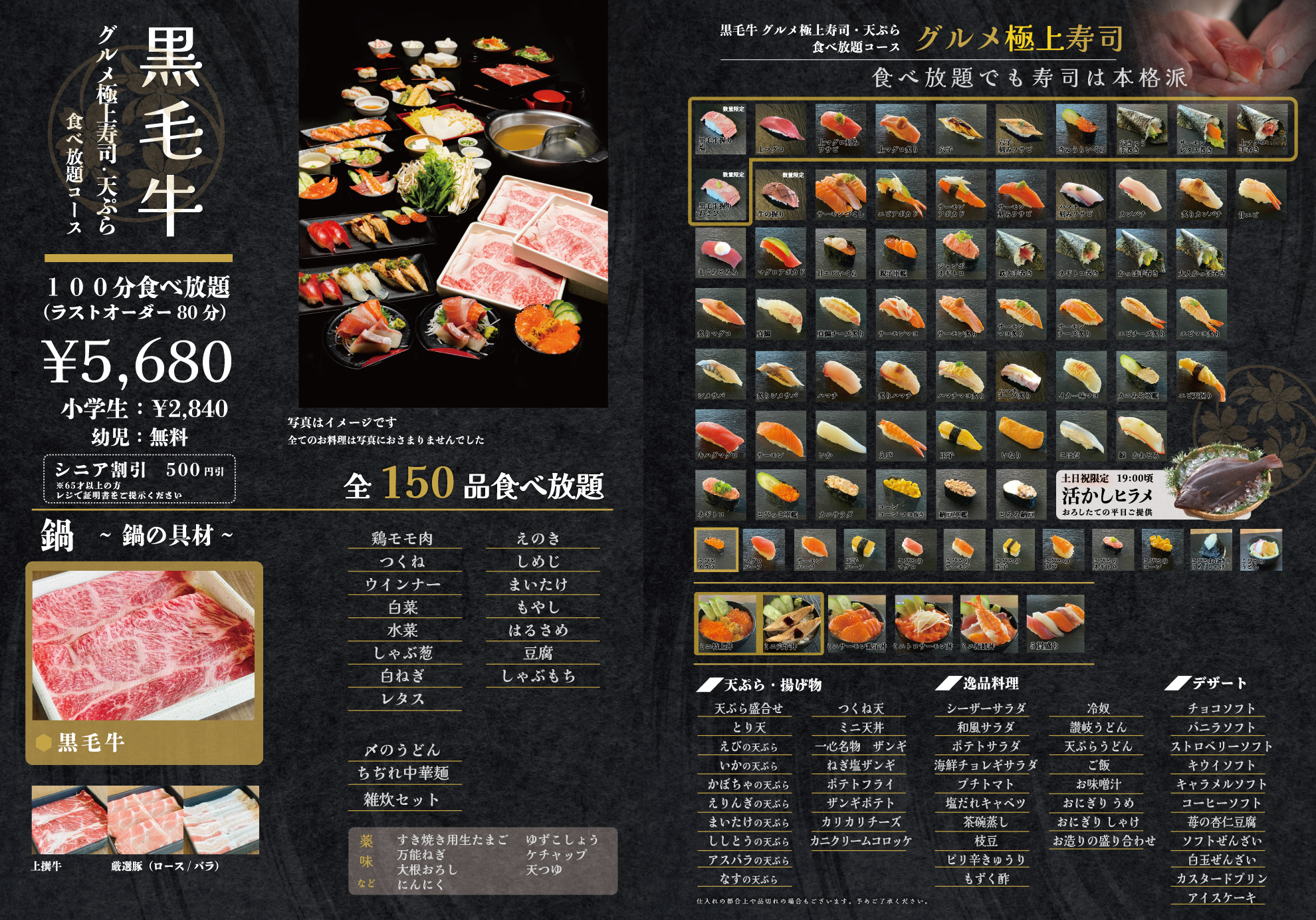 黒毛牛・天ぷら・グルメ炙り寿司 食べ放題コース(全150品)